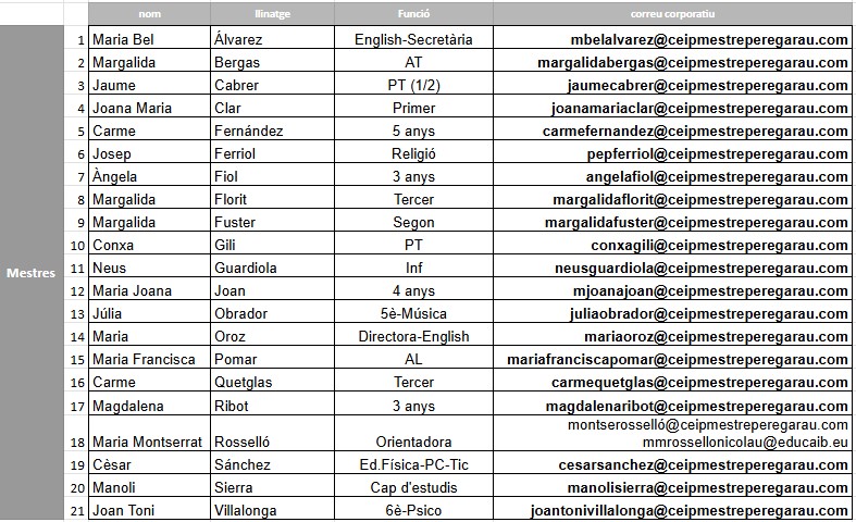 A continuació podeu consultar els correus corporatius de cada un dels membres de l’Equip educatiu del CEIP Mestre Pere Garau: